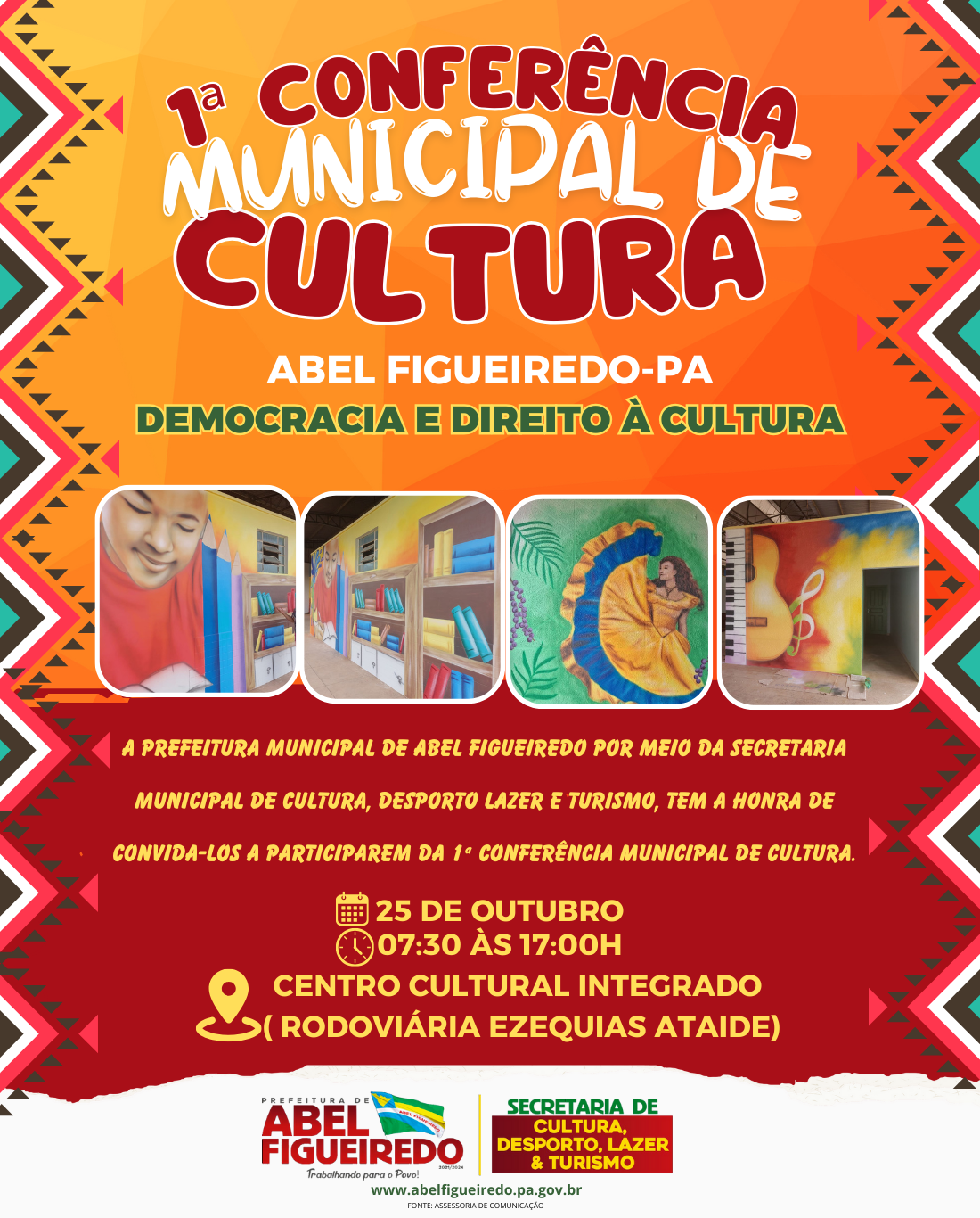 A Prefeitura de Abel Figueiredo administração Prefeito Antônio Calhau, vice Evandro da Serraria por meio da Secretaria Municipal de Cultura Desporto, Lazer e Turismo, Secretária Niramar Furlan e equipe, tem a honra de convidar todos os fazedores de cultura do município e região, assim como a sociedade em geral para a 1° conferência Municipal de Cultura de Abel Figueiredo.