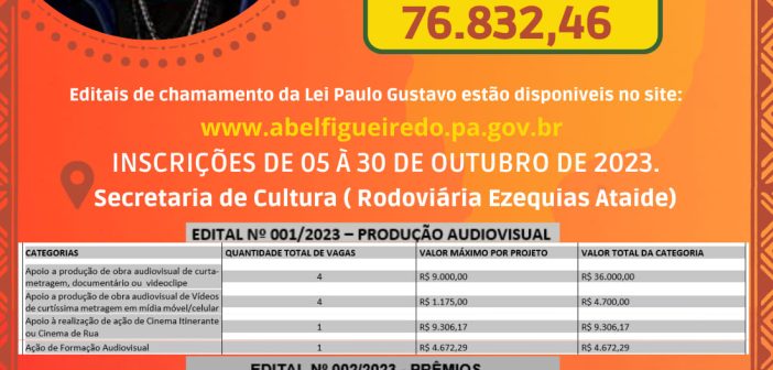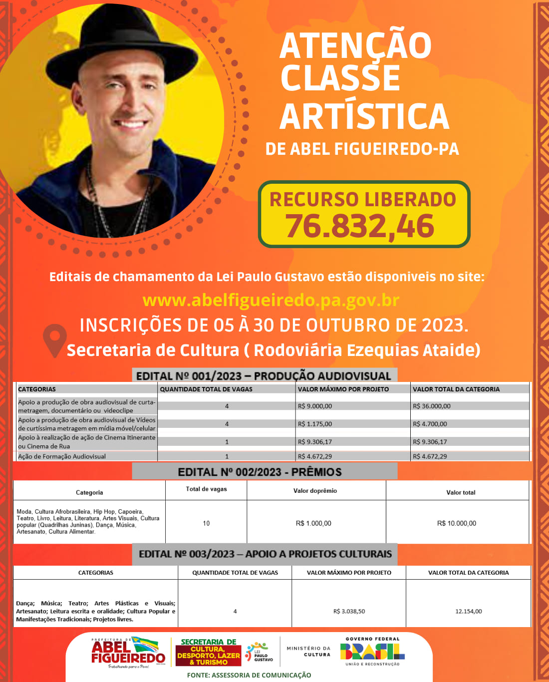 A Prefeitura Municipal de Abel Figueiredo administração Prefeito Antônio Calhau vice Evandro da Serraria por meio da Secretaria de Cultura, Desporto, Lazer e Turismo, Secretaria Niramar Furlan comunicam a todos os fazedores de cultura do município que o edital da Lei Paulo Gustavo já está liberado no site da prefeitura.