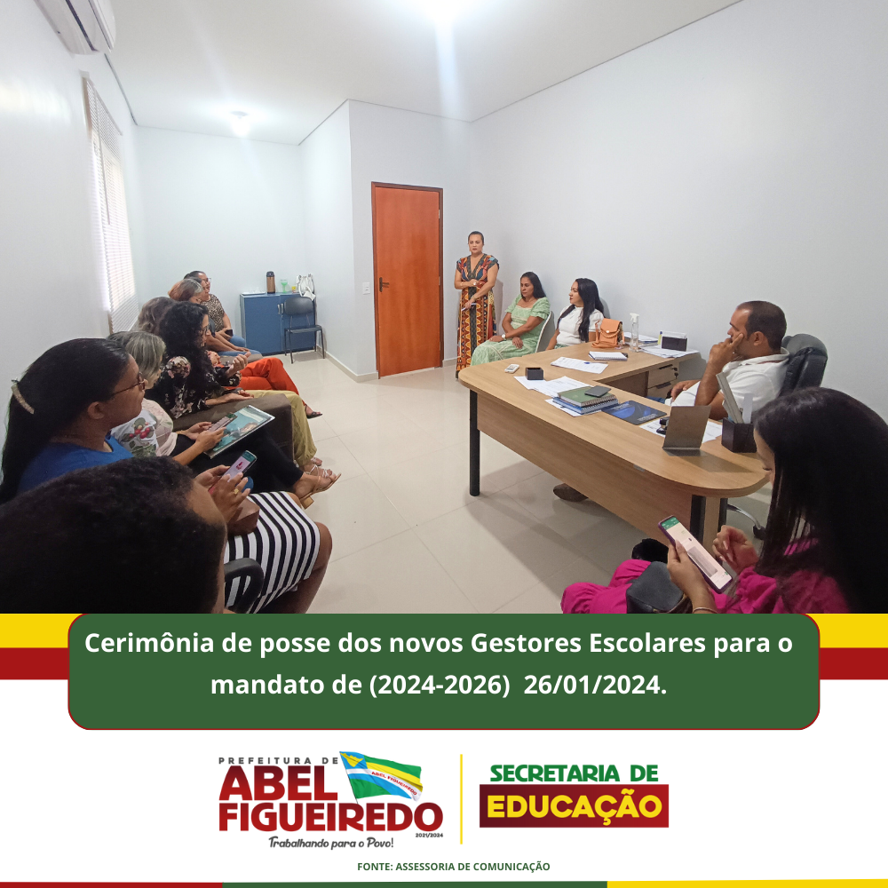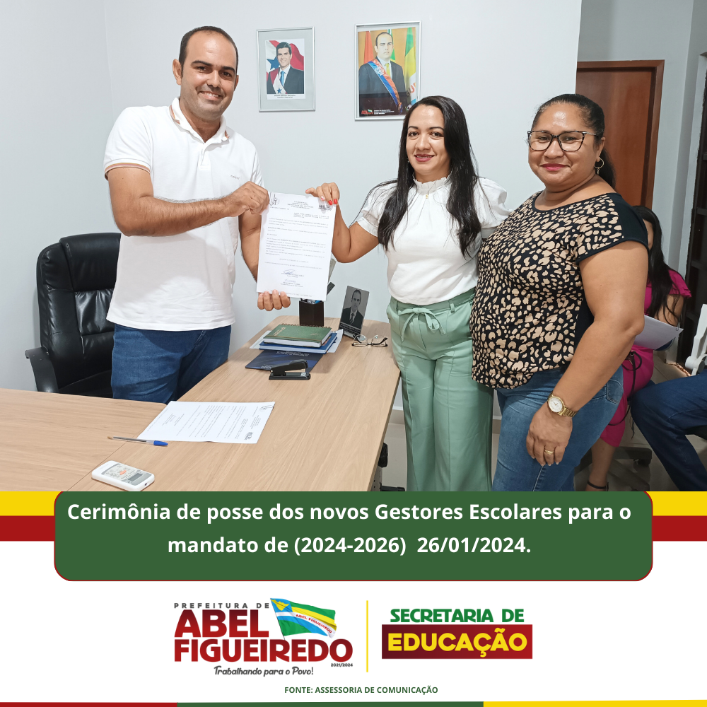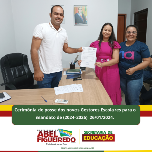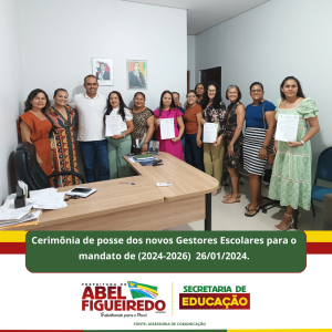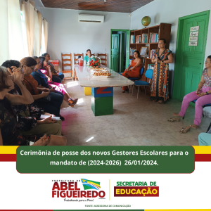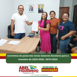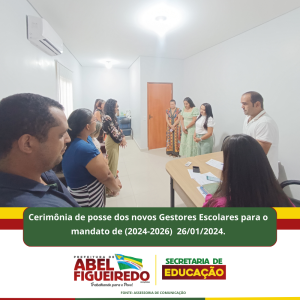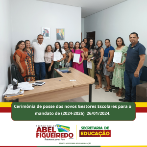 A Prefeitura Municipal de Abel Figueiredo, administração Prefeito Antônio Calhau, vice Evandro da Serraria, por meio da Secretaria Municipal de Educação, Secretária Rafaele Souza, realizaram na manhã desta sexta-feira (26), a cerimônia de posse dos novos Gestores Escolares para o mandato de 2024-2026.