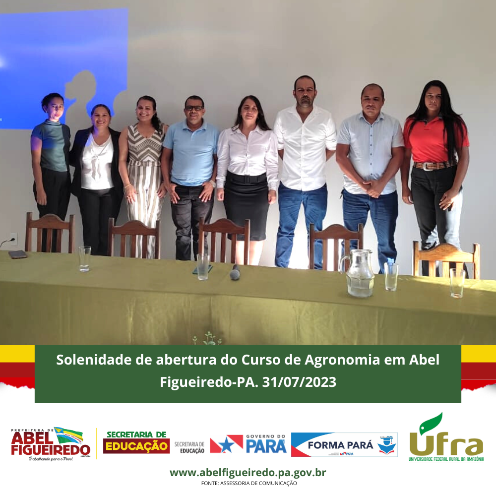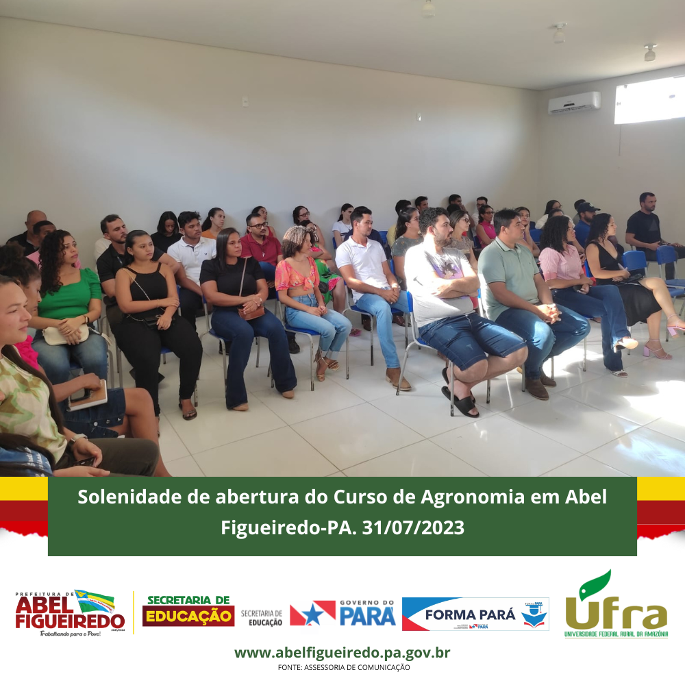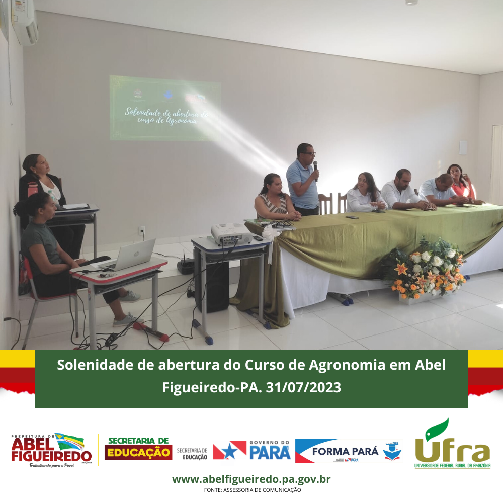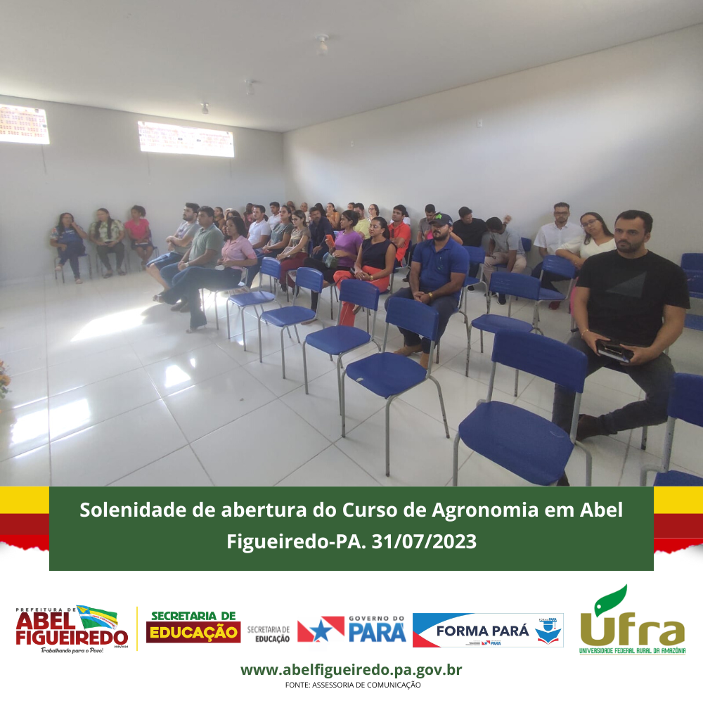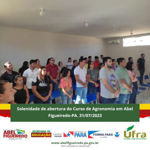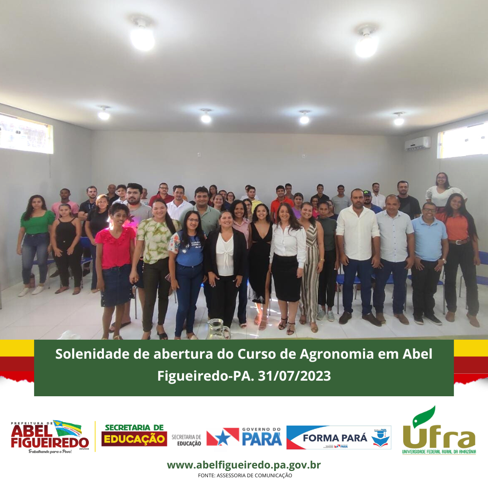 A Prefeitura de Abel Figueiredo administração Prefeito Antônio Calhau vice Evandro da Serraria, por meio da Secretaria Municipal de Educação, Secretária Rafaele Souza e equipe, em parceria com o Governo do Estado do Pará, Governador Helder Barbalho, através do Programa Forma Pará e a Ufra, Universidade Federal Rural da Amazônia, dão início a primeira turma do Curso de Agronomia no Município de Abel Figueiredo, uma parceria de sucesso que vai contribuir com a formação de 50 calouros em nossa cidade, em um auditório construído com recursos próprios na escola Alacid Nunes, levando oportunidade para os nossos jovens e reconhecendo a importância desta parceria e desta formação para nossa região que tem total apoio da Sindicato dos Produtores Rurais de Abel Figueiredo através do seu Presidente Leonardo Souza.