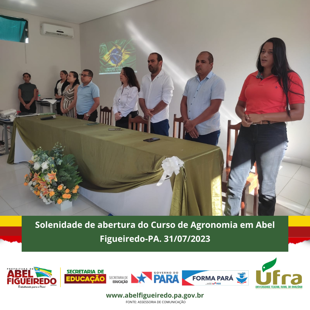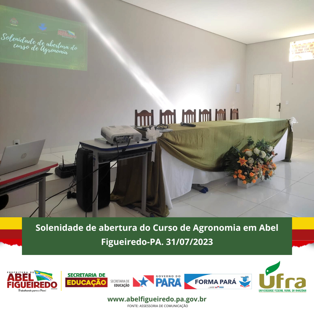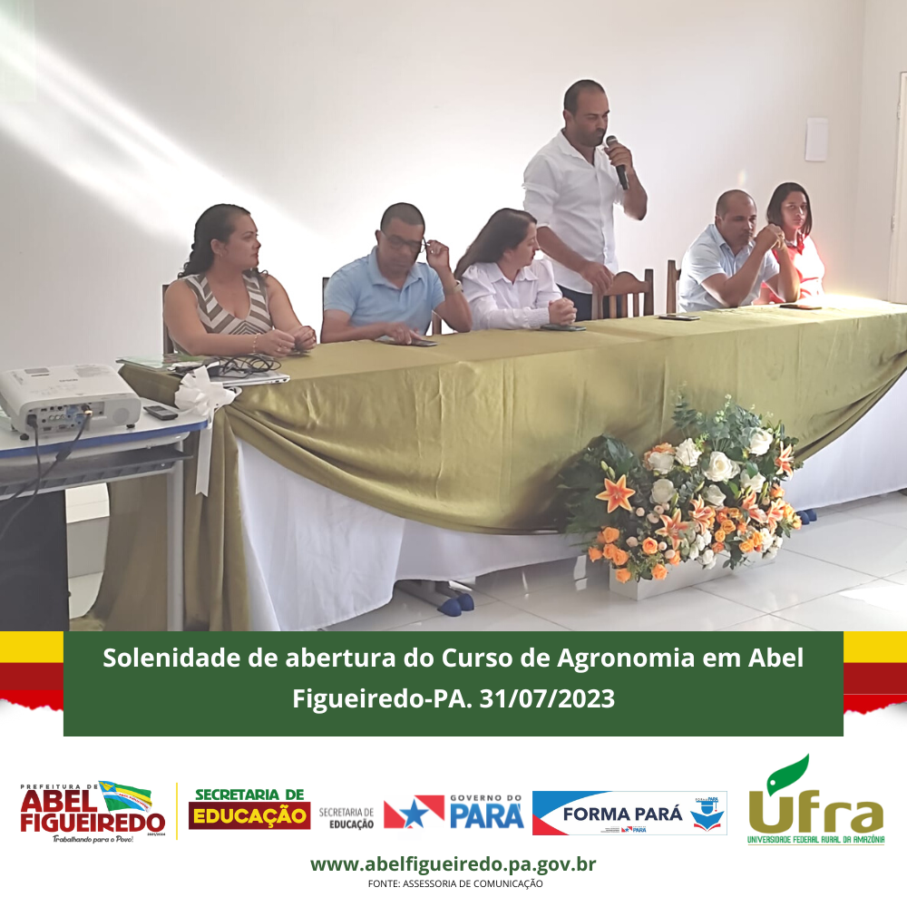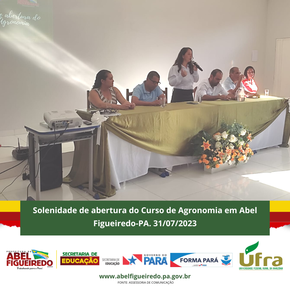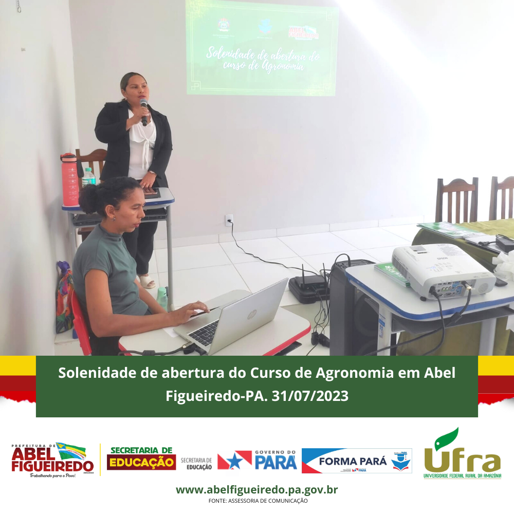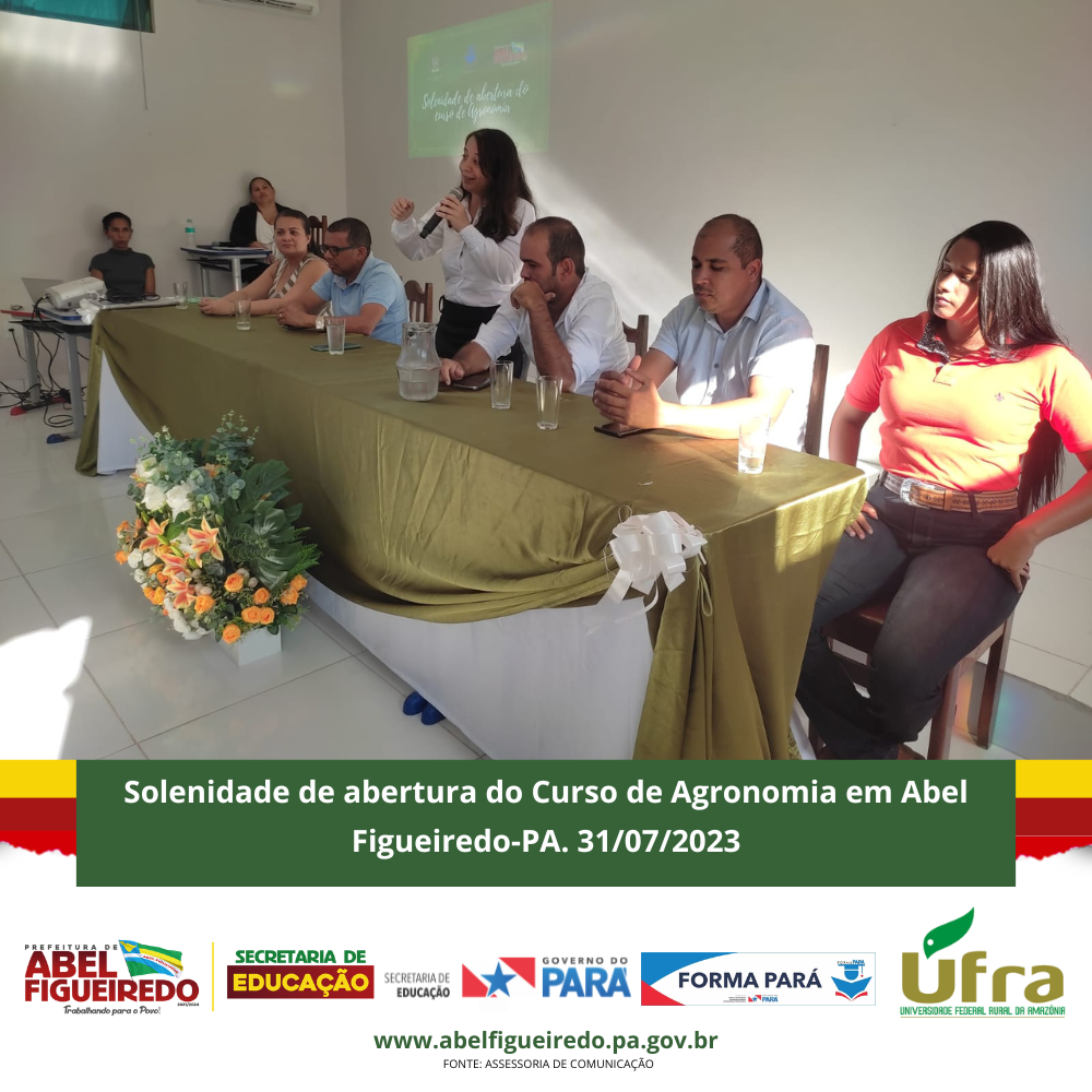 A Prefeitura de Abel Figueiredo administração Prefeito Antônio Calhau vice Evandro da Serraria, por meio da Secretaria Municipal de Educação, Secretária Rafaele Souza e equipe, em parceria com o Governo do Estado do Pará, Governador Helder Barbalho, através do Programa Forma Pará e a Ufra, Universidade Federal Rural da Amazônia, dão início a primeira turma do Curso de Agronomia no Município de Abel Figueiredo, uma parceria de sucesso que vai contribuir com a formação de 50 calouros em nossa cidade, em um auditório construído com recursos próprios na escola Alacid Nunes, levando oportunidade para os nossos jovens e reconhecendo a importância desta parceria e desta formação para nossa região que tem total apoio da Sindicato dos Produtores Rurais de Abel Figueiredo através do seu Presidente Leonardo Souza.